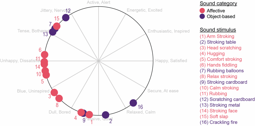 L’étude a examiné les émotions suscitées par l’écoute de sons correspondant à l’enregistrement de gestes tactiles affectifs organiques, c’est-à-dire réels (par exemples, caresse de l’avant-bras, effleurement de la joue). Les gestes ont été enregistrés sur d’autres personnes que ceux qui les écoutent et ils sont présentés de manière isolée. L’étude a été motivée par la diminution constante de l’engagement dans le toucher interpersonnel, en grande partie due à la numérisation de l’expérience humaine. Cette diminution a montré des effets délétères sur les individus et les prive (tant les personnes qui touchent que celles qui sont touchées) des nombreux bénéfices du toucher affectif, notamment la régulation émotionnelle. Il devient donc particulièrement pertinent d’étudier des moyens alternatifs de transmettre les bénéfices du toucher affectif, par exemple via différentes modalités sensorielles. Ici, le son constitue une option intéressante compte tenu de la relation étroite entre les ondes auditives et tactiles.